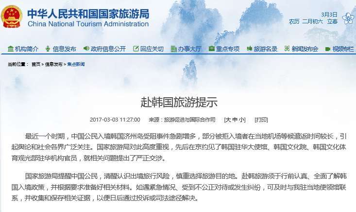 3月3日,国家旅游局在官网上发布消息称,最近一个时期,中国公民入境韩国济州岛受阻事件急剧增多,部分被拒入境者在当地机场等候遣返时间较长,引起舆论和社会各界广泛关注。国家旅游局对此高度重视,先后在京约见了韩国驻华大使馆、韩国文化院、韩国文化体育观光部驻华机构官员,就相关问题提出了严正交涉。