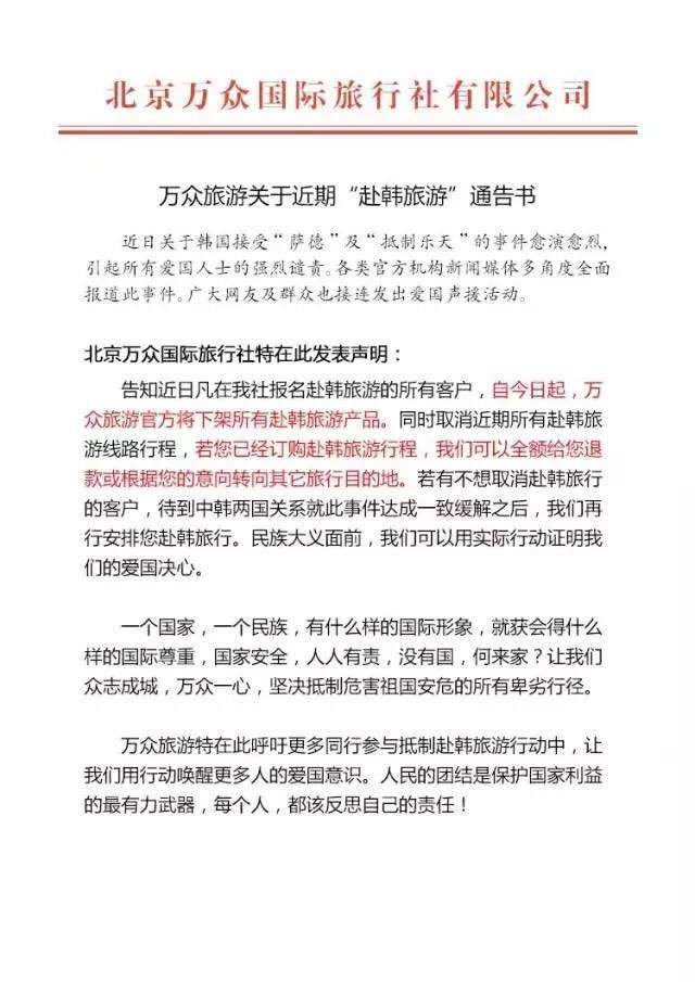 北京万众国旅已经发布公告称,将下架所有赴韩旅游产品。
