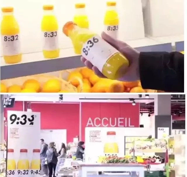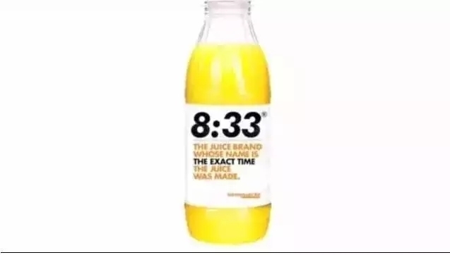 于是,这家超市推出了一款“即时鲜榨”的橙汁产品。为了体现果汁新鲜程度,超市直接在瓶子的包装上贴上了果汁的榨出时间,精确到分钟,如下图为 8:33。而每一瓶的榨汁时间都在变化,所以他们的名字也不一样,每瓶上都有独一无二的标签。