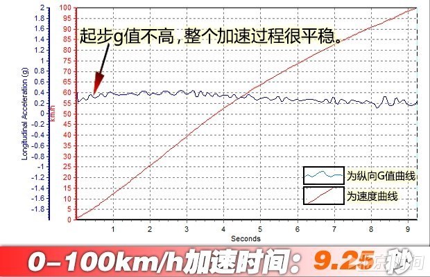 ◆ 0-100km/h加速性能测试: 我们之前曾经在试驾会上测过加速,当时的成绩是9.39秒,这回在测试场地里,它跑得稍微快了一些,达到9.25秒。这个性能水平基本相当于1.5T车型,对于大多数人来说也够用了。