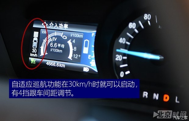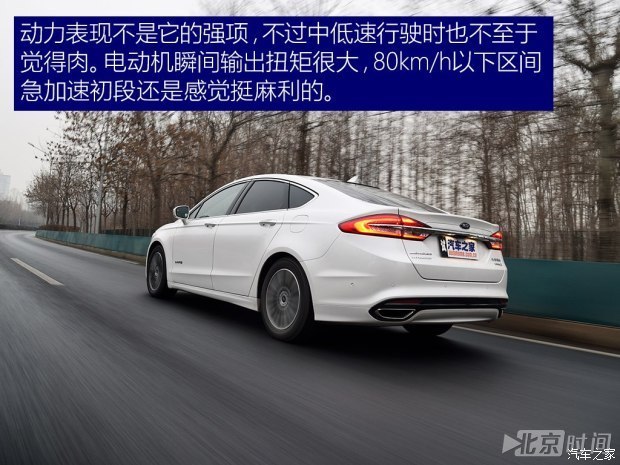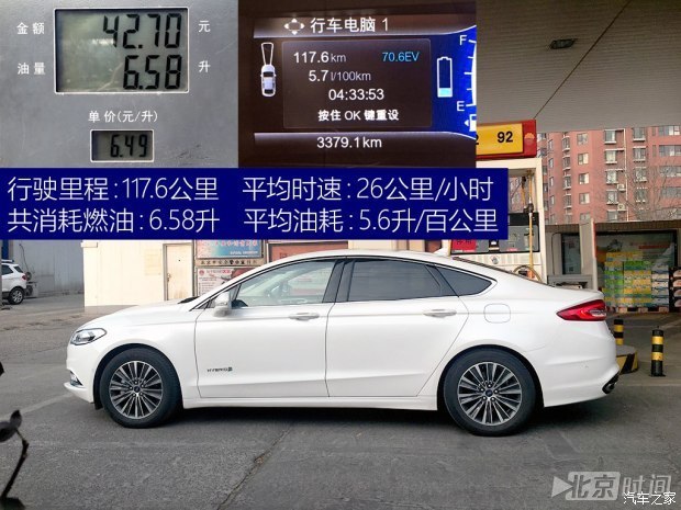 对咱们来说,买混动车,什么环保啊为人类可持续发展做点贡献啊之类的伟大理想就别聊了,其实最直接目的无非主要就是为了省油。其实我喜欢省油车,省多少钱都是其次,关键三天两头跑加油站很麻烦的。而且北京市里的加油站经常排队,耽误不少工夫,少烧点油,少去几次加油站能节约出不少时间。 ◆ 油耗测试: 说说油耗表现。实际测试中我们驾驶这款车共行驶了117.6公里,耗时4个半小时,平均时速26公里/小时,这个数值已经比我们大多数油耗测试路况的平均时速都要低,因为测试那两天北京实在太堵车。结果这款车消耗燃油6.58升,平均油耗为5.6升/百公里。我认为在这样拥堵的路况下能取得这样的成绩还算不错。我们之前也测试过雅阁和凯美瑞的混动,蒙迪欧混动看上去应该介于二者之间,不过由于油耗测试路况不同所以不能直接来对比,以后有机会可以横评一下。