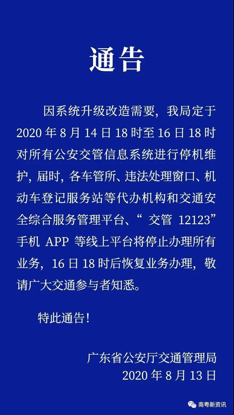 广东交警消息,因系统升级改造需要,广东省公安厅交通管理局定于