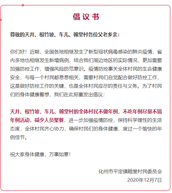 2020年已经接近尾声,茂名将迎来牛年的年例期。近日,茂名化州市平定镇翰堂村民委员会率先发出倡议书,倡议天井、根竹坡、车儿、翰堂等村不搞年例,自觉坚持疫情防控不放松。
