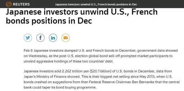 美债作为世界上公认的安全性资产之一,是很多国家首选持有的资产,比如中国、日本等大型经济体多年来一直是美债的坚定持有者,然而这种情况却在特朗普上台后发生变化,如今各国正不断将所持美债以创纪录的方式进行抛售。 2月8日,路透社援引日本财务省消息称,日本投资者在12月份抛售2.262万亿日元(201亿美元)的美国债券,创下2013年5月以来最大净抛售规模。
