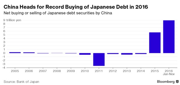 ▲路透报道截图 中国同样如此,自2016年5月开始,中国已经持续6个月减持美债,大量减持之后,中国已经丢掉了美国第一大债权国的位置。 此消彼长,中国大量减持美债后,必然要寻找其他的资产进行替代,此时中国购买的是哪种资产呢?答案是--日本国债。 负利率的日本债券遭"爆买" 日本财务省最新数据显示,2016年中国投资者净买入11.2万亿日元(998亿美元)日本债券,是2005年以来的最高水平,中国已经成为全球最大的日本债券持有者。其中净买入短期债7.25万亿日元,净买入中长期债3.95万亿日元。 在此之前,持有日本债券最多的7个国家分别为:卢森堡、美国、英国、法国、中国、新加坡、比利时。