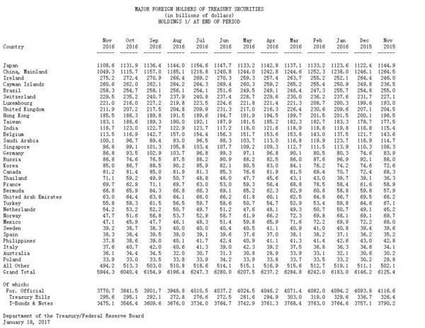 ▲中国和日本美债持有持续下降(图片来源:FT中文网) 此外,据美国财政部1月18日公布的月度报告,截至去年11月末,外资持有美国国债总额为5.94万亿美元,较10月锐减961亿美元,达到2014年以来最低水平。