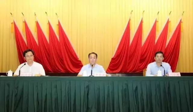 潮州市领导干部大会在市党政机关会堂召开,罗冀京(中)、刘小涛(右一)、殷昭举在主席台就座。