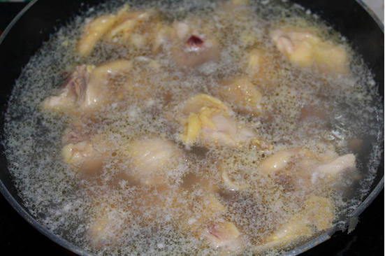 3.锅中倒凉水,鸡腿肉下锅,煮开。