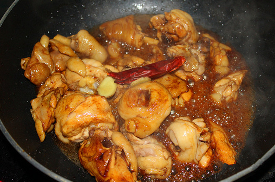 6.鸡腿控干不要带水,倒入锅中翻炒,加适量的料酒,姜片和2个干辣椒,如果这时候想放土豆的,可以放进去翻炒一会,味道会更好。